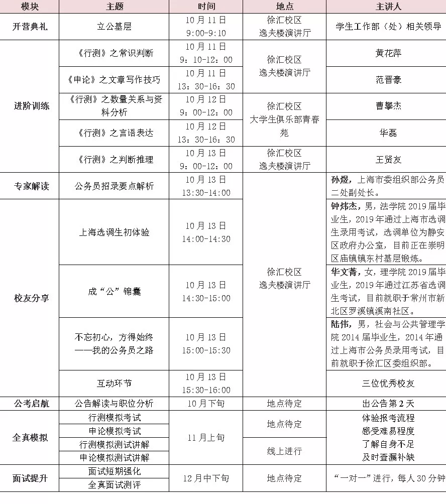 好风凭借力,扬帆正当时。2020年度各省市选调生、公务员招考工作已陆续开展,为了鼓励华理有志学子响应国家号召加入公职人员队伍、赴基层干事创业,校学生就业指导服务中心将于10月11日-13日开展“砺公计划”训练营。通过政策解读、校友分享、进阶培训等多种方式,增进学生对于公共部门工作的了解,强化到基层工作的信念,提高基层公共部门就业胜任力,培养并输送一批优秀华理学子到各省市公共部门工作。